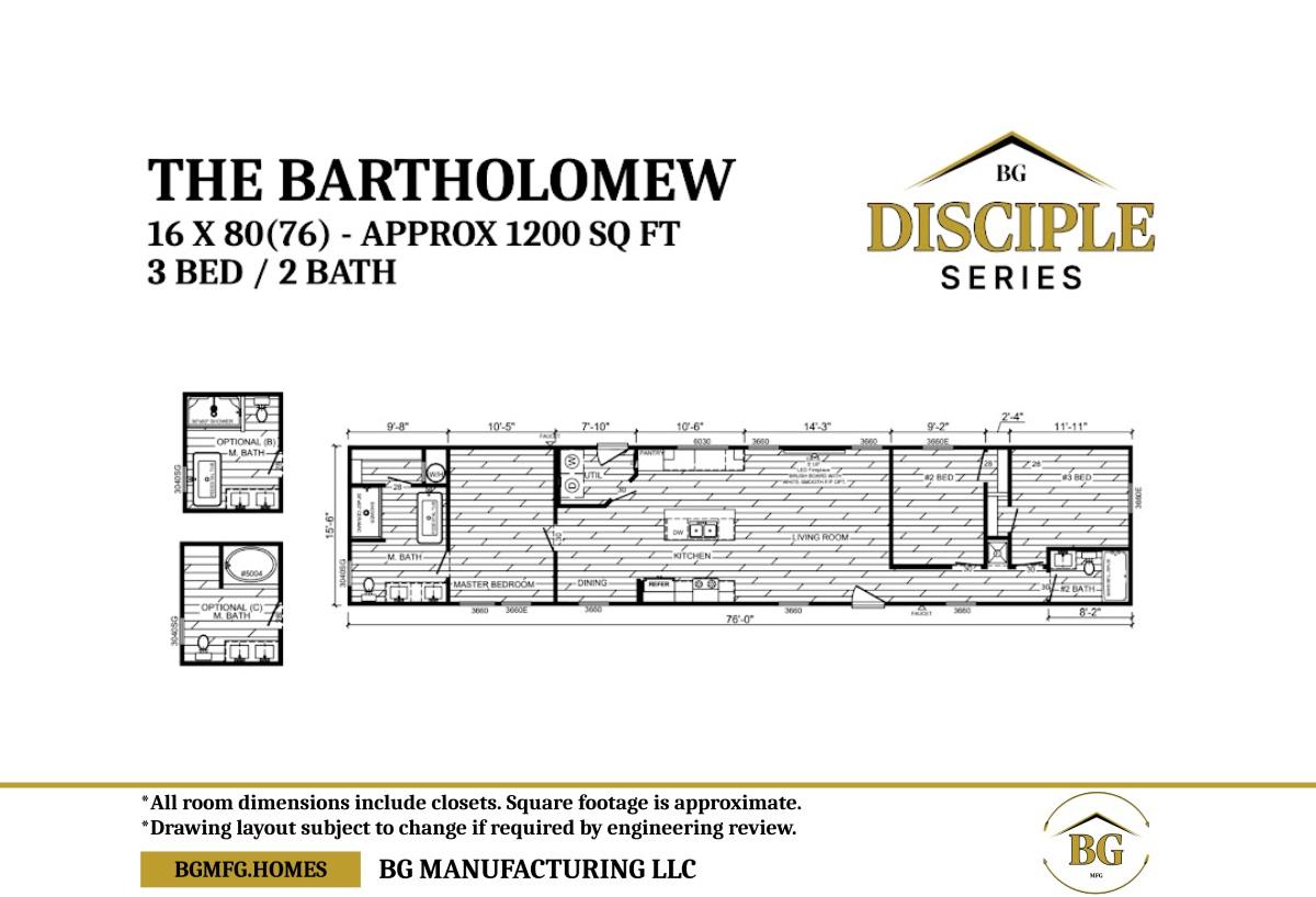 The Disciple Series / The Bartholomew built by BG Manufacturing offers smart design and comfortable living in a layout that feels just right. With 1,200 square feet, 3 bedrooms, and 2 bathrooms, The Bartholomew makes the most of every inch. The open living room connects to the kitchen and dining area, creating an easy flow for family time or entertaining friends. The private primary suite features its own bath, while two additional bedrooms share a full bath nearby. A handy utility space adds everyday convenience. The Bartholomew delivers value, style, and function in one inviting home.
